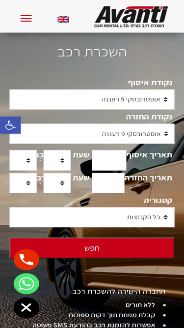 97%השכרת רכב וליסינג 24/7 רק עם AVANTI! שירותי השכרת רכב ליום, לשבוע או לכל תקופת זמן שרק תרצו עם רכבים חדישים ומאובזרים. לפרטים והזמנה מהירה >>