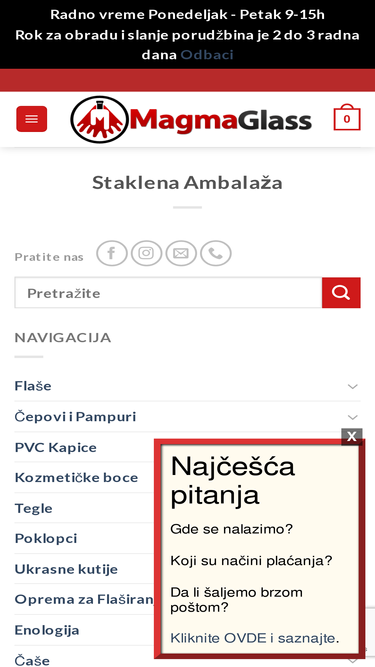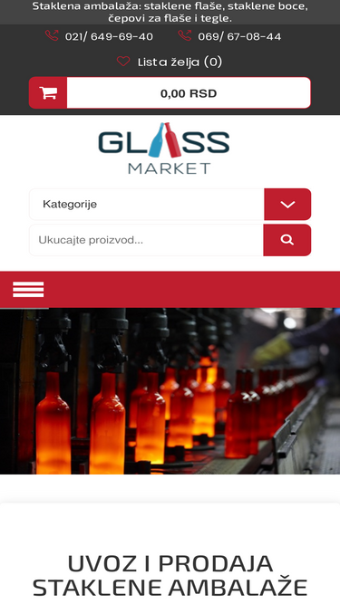 100%Staklena ambalaža raznih modela, staklenih flaša i staklenih tegla. Uvoz i prodaja staklene ambalaže, sve vrste zatvarača, poklopaca, čepova i pvc kapica.