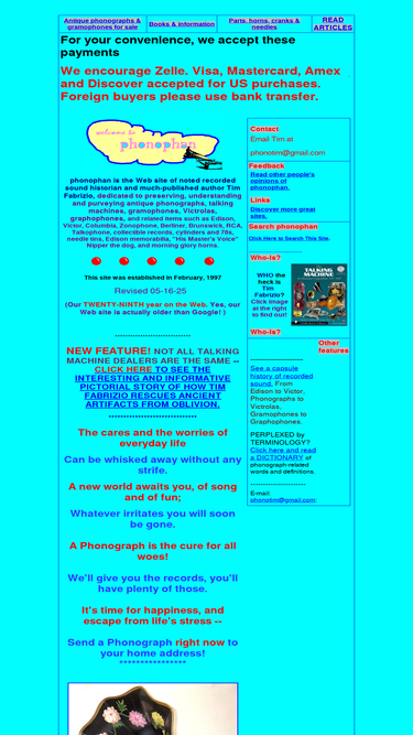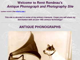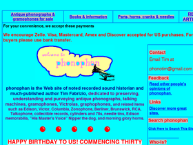 81%complete web site for antique phonographs, gramophones, victrolas, old time music, sound recording history. buy authentic antique music machines. visa, mastercard, american express, discover.