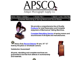 80%apsco, antique phonograph supply company, makers of quality main springs, complete rebuilding of movements for phonographs and music boxes. wholesale discounts available. literature, decals, needles, horns, victrola, phonograph, victrola needles, victrola repair, victrola parts, phonograph needles, phonograph repair, phonograph parts, steel needles, talking machine, antique phonographs