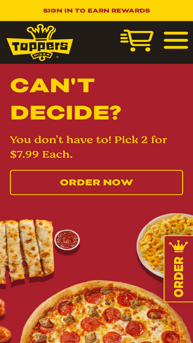 100%delivery or carry out, late night or right now - toppers pizza has you covered. try our famous topperstix cheesy bread or one of our specialty pizzas now.