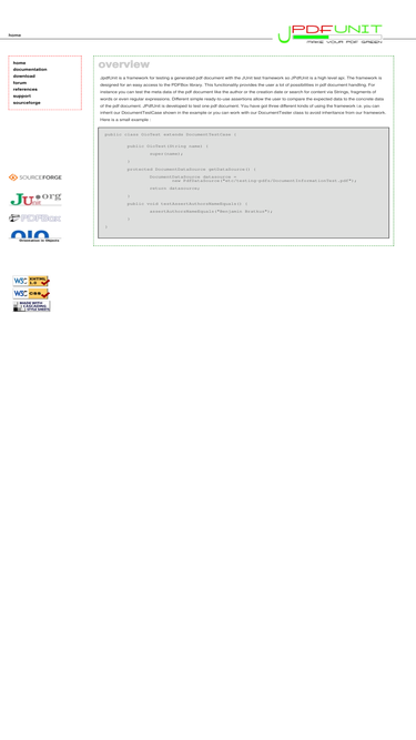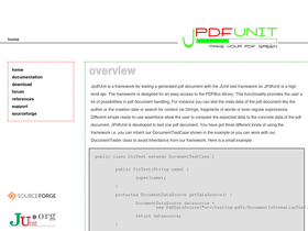 83%jpdfunit hompage, jpdfunit is a framework for testing a generated pdf document with the junit test framework. the pdf library pdfbox is used to provide the functionality of pdf document handling.