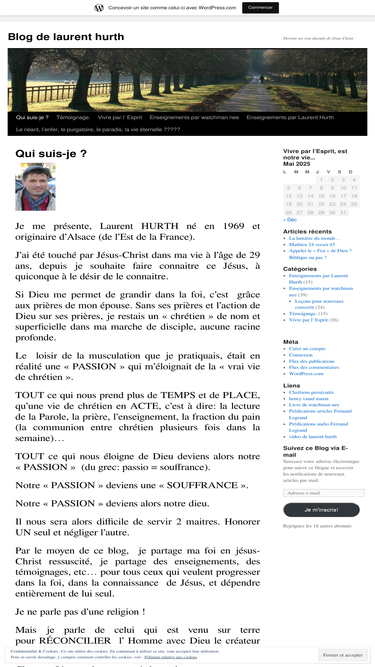 je me présente, laurent hurth né en 1969 et originaire d'alsace (de l'est de la france). j'ai été touché par jésus-christ dans ma vie à l'âge de 29 ans, depuis je souhaite faire connaitre ce jésus, à quiconque à le désir de le connaitre. si dieu me permet de grandir dans la foi, c'est grâce…