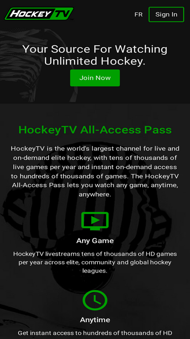 100%hockeytv is the world's biggest platform of live and on-demand broadcasts for ice hockey national governing bodies, leagues, teams, and events. watch any game, anytime on your tv, computer, tablet or phone.