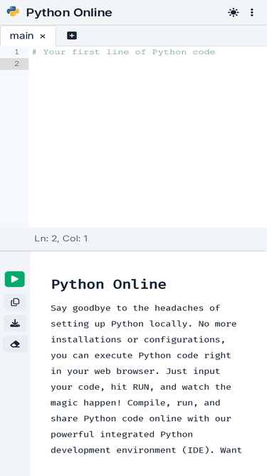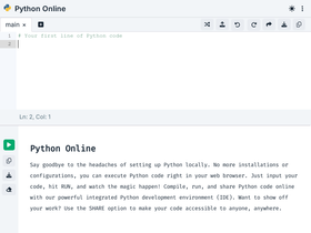 89%Run Python code online with our advanced, user-friendly Python compiler, editor, and IDE. Experience seamless coding in your browser.