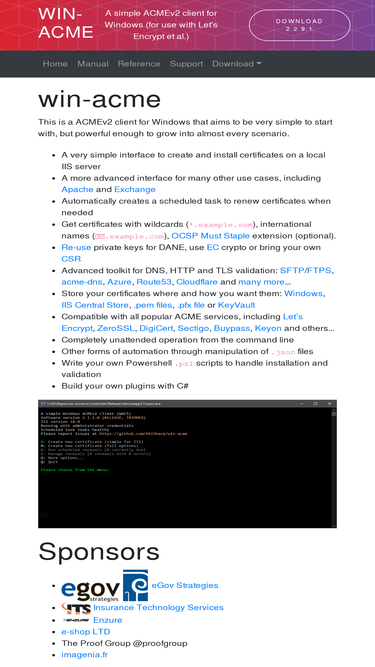 76%win-acme is a acmev2 client for windows that aims to be very simple to start with, but powerful enough to grow into almost every scenario.