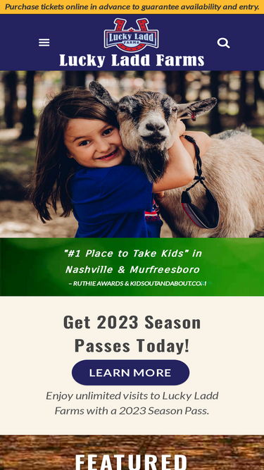 89%lucky ladd farms, award winning family attraction located near nashville, tn, offers a unique farm experience with fun activities for all ages. learn more about their famous petting farm, zoo, festivals and seasonal events. lucky ladd's offers you-pick tulips, strawberries, sunflowers, and a pumpkin patch.