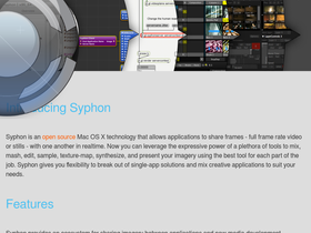63%syphon is an open source mac os x plugin technology that allows applications to share frames - full frame rate video or stills - with one another in realtime, instantly. no rendering to a file, no screen capture involved. this means you can leverage the expressive power of a plethora of tools and mix, mash, edit, sample, texture map, synthesize, and present your imagery using the best tool for the job. syphon gives you flexibility to break out of existing graphics pipelines and mix creative applications to suite your need.