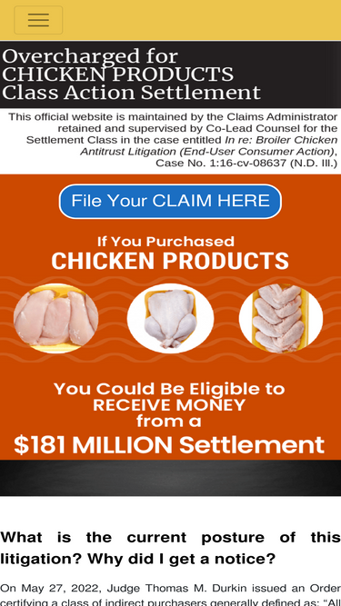 90%if you purchased any chicken product from january 1, 2009, through december 31, 2020, you may be eligible to receive money from a class action settlement.