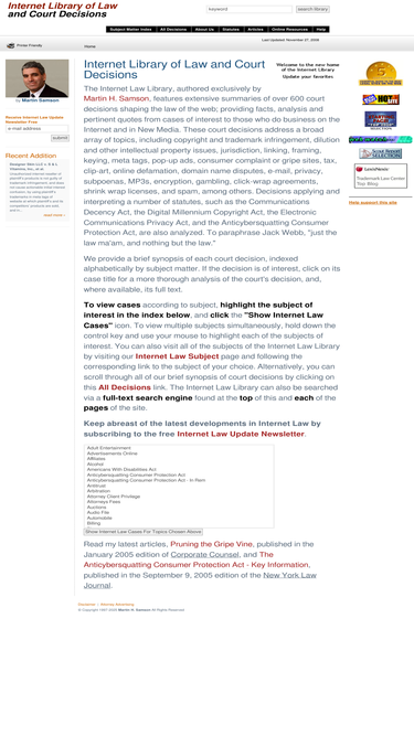 88%our internet law library features extensive summaries of court decisions shaping the law of the web; providing facts, analysis and pertinent quotes from cases covering domain name disputes, email, jurisdiction, linking, spam, trademark, contract, copyright, online defamation, encryption, first amendment, gambling, right of publicity, shrink-wrap, venue, clip art.