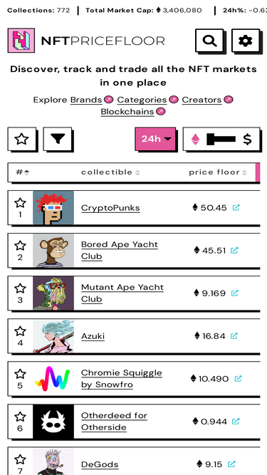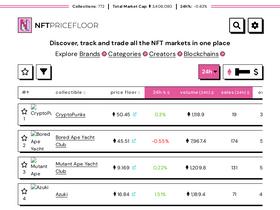 82%track the floor price, historical price chart, sales data & trade volume of the top nft collections. we're the best nft data and marketplace aggregator