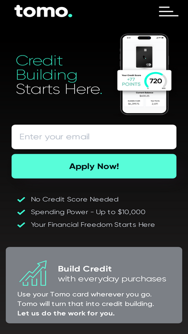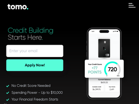 credit building starts here. no credit history required. apply in minutes! enjoy benefits & coverage valued at $1,300+. build / grow credit with tomocredit.