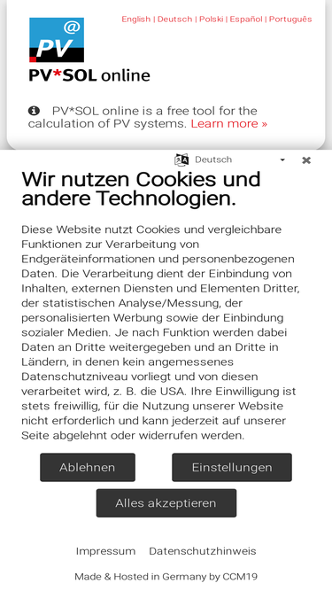 100%pv*sol online is a free tool for the calculation of pv systems. made by valentin software, the developers of the full featured market leading pv simulation software pv*sol, this online tool lets you input basic data like location, load profiles, solar power (photovoltaic, pv) module data, inverter manufacturer. we then search for the optimal connection of your pv modules and the inverter that suits best. after the simulation of the system, the results are presented: annual pv energy, performance ratio, own power consumption, solar fraction, and many more ...