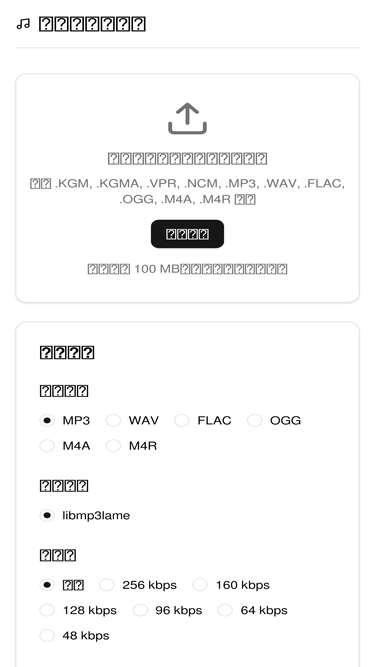 本站提供云音乐格式批量在线转换,浏览器本地转换,无需上传,可将ncm批量在线转换为mp3, ncm批量在线转换为flac, qmc批量在线转换为mp3, uc批量在线转换为mp3, uc批量在线转换为flac, kwm批量在线转换为mp3, kwm批量在线转换为flac, xm批量在线转换为mp3, xm批量在线转换为wav, xm批量在线转换为flac, xm批量在线转换为m4a, tm0批量在线转换为mp3, tm3批量在线转换为mp3, qmc3批量在线转换为mp3, qmc2批量在线转换为ogg, qmc0批量在线转换为mp3, qmcflac批量在线转换为flac, qmcogg批量在线转换为ogg, tkm批量在线转换为m4a, bkcmp3批量在线转换为mp3, bkcm4a批量在线转换为m4a, bkcflac批量在线转换为flac, bkcwav批量在线转换为wav, bkcape批量在线转换为ape, bkcogg批量在线转换为ogg, bkcwma批量在线转换为wma, mggl批量在线转换为ogg, mflac批量在线转换为flac, mflac0批量在线转换为flac, mgg批量在线转换为ogg, mgg1批量在线转换为ogg, mgg0批量在线转换为ogg, 666c6163批量在线转换为flac, 6d7033批量在线转换为mp3, 6f6767批量在线转换为ogg, 6d3461批量在线转换为m4a, 776176批量在线转换为wav, tm2批量在线转换为m4a, tm6批量在线转换为m4a, cache批量在线转换为mp3, vpr批量在线转换为mp3, kgm批量在线转换为mp3, kgma批量在线转换为mp3,支持预览、下载等功能
