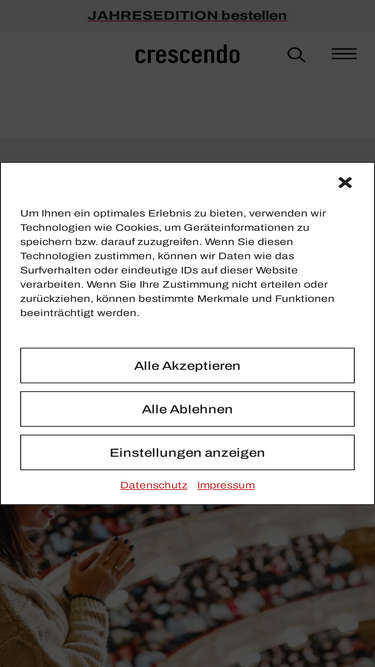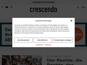 84%crescendo ist eines der größten Magazine für klassische Musik im deutschsprachigen Raum mit einer Auflage von ca. 70.000 Exemplaren. Die Zeitschrift erscheint jährlich mit sieben Ausgaben. crescendo liefert Essays, Rezensionen und Blicke hinter die Kulissen