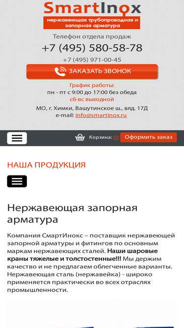100%запорная арматура из нержавейки от проверенных и качественных поставщиков от компании "смартинокс". мы предлагаем широкий ассортимент изделий высокого качества из нержавеющей стали. поможем с выбором, звоните: +7 (495) 580-58-78