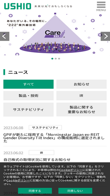 79%ウシオ電機のサイトマップ。ウシオ電機は、新光源や独自の光学技術の開発により、光技術を「あかり」の領域だけでなく、産業や科学技術の先端分野で「エネルギー」として幅広く利用され、数多くの「世界シェアNo.1」製品の誕生に貢献しています。