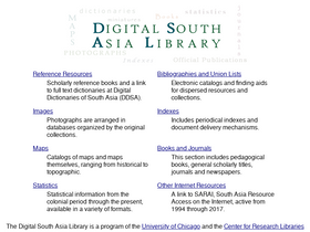 89%the digital south asia library provides dictionaries, gazetteers, photographs, prints, drawings, maps, statistics, bibliographies, indexes, books, and journals for reference and research concerning south asia.