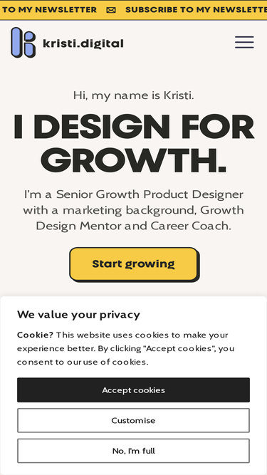 80%Kristina Volchek is a Senior Growth Product Designer with a marketing background and a Freelance UX/UI Designer specializing in Beehiiv, Webflow, and Shopify. She helps content creators and solopreneurs overcome their design challenges. Let's talk!