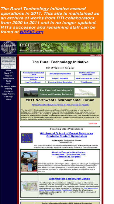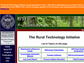 leads to the rural technology initiative (rti) website, with forest technology transfere to rural communities as the focus. forest technology includes the landscape management system (lms), geographic information systems (gis), and global positioning systems (gps).