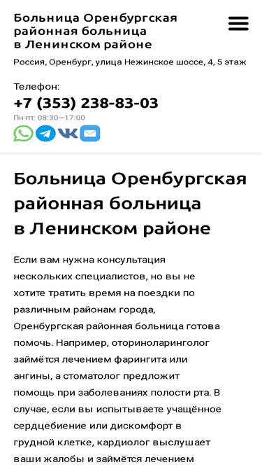 если вам нужна консультация нескольких специалистов, но вы не хотите тратить время на поездки по различным районам города, оренбургская районная больница готова помочь. например, оториноларинголог займётся лечением фарингита или ангины, а стоматолог предложит помощь при заболеваниях полости рта. в случае, если вы испытываете учащённое сердцебиение или дискомфорт в грудной клетке, кардиолог выслушает ваши жалобы и займётся лечением аритмии, гипотонии, пороков сердца и других заболеваний. также в больнице доступны консультации эндокринолога, онколога и венеролога. больница расположена по адресу: россия, оренбург, нежинское шоссе, 4. если у вас остались вопросы касательно услуг, вы можете узнать ответы по телефону +7 (3532) 38-83-03. мы рады видеть вас с понедельника по пятницу с 08:30 до 17:00.