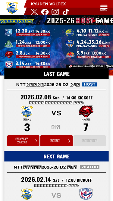 100%ジャパンラグビーリーグワンのチーム、九州電力ラグビー部キューデンヴォルテクスの公式サイトへようこそ!福岡市をホストエリアとし、九州全域をフレンドリーエリアとして活動しています。最新のチーム情報、選手紹介、試合情報など、九州電力ラグビー部に関連する多彩な情報を提供しています。ファンクラブ入会やメルマガ登録も受付中です。