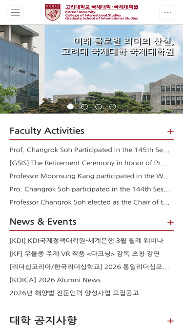 65%고려대학교 국제학부와 국제대학원에 오신 여러분을 진심으로 환영합니다. 국제학부는 2002년 고려대학교의 세계화 비전에 따라 출범하였으며, 국제대학원은 그 보다 앞서 1991년 대한민국 정부의 세계화 정책의 일환으로 시작되었습니다. 현재 학부와 대학원에서 700여명의 인재들과 40여명의 교수진이 서로 협력해 최고의 교육과 연구를 지향하고 있습니다.