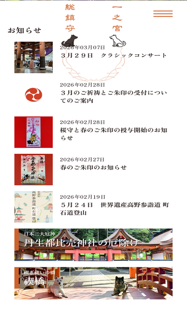 丹生都比売神社(にうつひめじんじゃ)は、世界遺産「紀伊山地の霊場と参詣道」の一部として知られる、1700年以上の歴史を持ち、高野山の守り神として弘法大師空海とも深い縁があります。神様のお使いであるご神犬にまつわる伝説も残されています。厄除けや必勝祈願、ペットのご祈祷など、様々なご祈願を承っております。