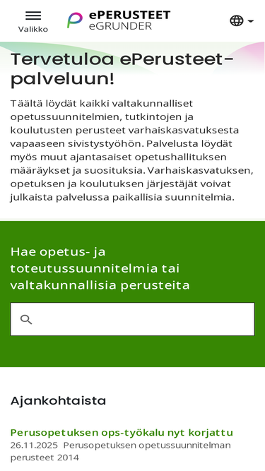 Täältä löydät kaikki valtakunnalliset opetussuunnitelmien, tutkintojen ja koulutusten perusteet varhaiskasvatuksesta vapaaseen sivistystyöhön. Palvelusta löydät myös muut ajantasaiset opetushallituksen määräykset ja suosituksia. Varhaiskasvatuksen, opetuksen ja koulutuksen järjestäjät voivat julkaista palvelussa paikallisia suunnitelmia.