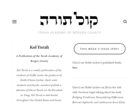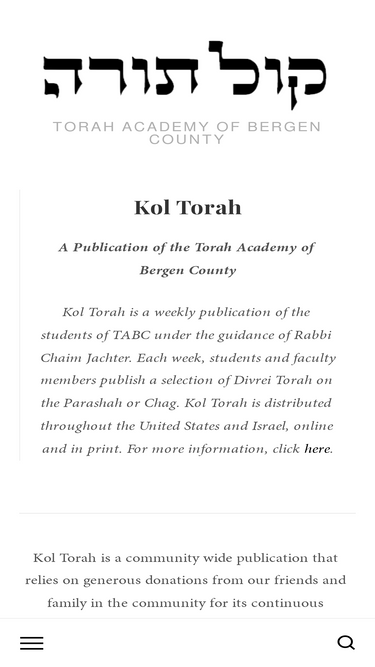 78%Kol Torah is a weekly publication of the students of TABC under the guidance of Rabbi Chaim Jachter. Each week, students and faculty members publish a selection of divrei Torah on the Parashah or Chag. Kol Torah is distributed to hundreds of shuls across the United States and Internationally and the