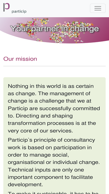 85%particip gmbh is an independent, internationally-recognised consultancy company. our services focus on international development and include monitoring and evaluation, capacity and organisational development, technical assistance, policy advice, development of management guidelines at policy, programme and project level, and studies, surveys and analyses and all services covering a broad variety of sectors and themes.