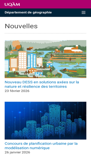 100%Coordonnées du département Adresse postale Université du Québec à Montréal Département de géographie Case Postale 8888, succursale centre-ville Montréal (Québec) H3C 3P8 Adresse civique Université du Québec à Montréal Département de géographie Local A-4030 1255, St-Denis Montréal (Québec) H2X 3R9 Téléphone et télécopieur Secrétariat: (514) 987-4131 Télécopieur: (514) 987-6784 dept.geographie@uqam.ca Carte La carte de Google […]