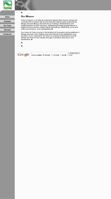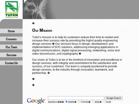 100%tufon's goal is to provide engineering design services in design, development, and implementation of soc solutions. in digital communications, digital signal processing, networking, voice and video transmis sion, and cryptography, and software developement.