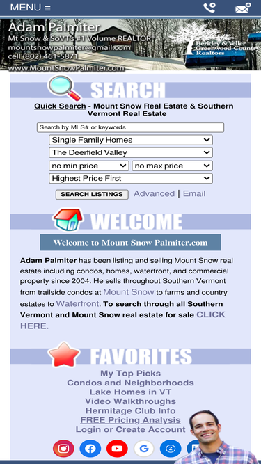 95%#1 Volume Realtor at Mount Snow since 2010. Search ski condos, lake homes, luxury estates & Southern VT MLS listings. 1,700+ properties sold. Call Adam Palmiter.