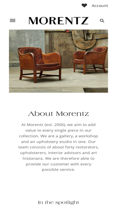 75%Founded in 2006, Morentz is a unique hub for 20th century furniture; we're a gallery, restoration workshop, and upholstery studio combined. We're committed to enhancing value in our vast vintage collection, supported by a skilled team of restorers, upholsterers, interior advisors, and art historians.