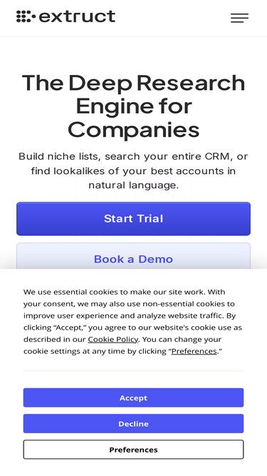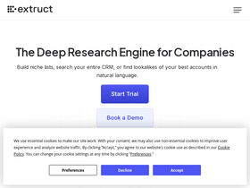 76%Start researching companies in minutes with Extruct AI. Unlike traditional databases, use natural language search and intelligent scoring to find exactly what you need.