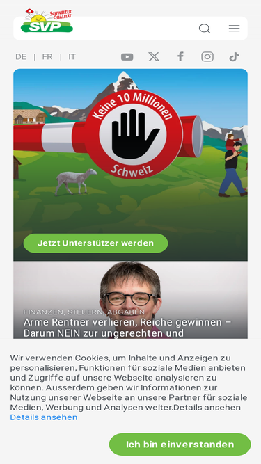 82%MENSCHEN WIE DU UND ICH. Bauern, Hausfrauen, Secondos, Studenten, Lehrlinge, selbstständig Erwerbende, Lehrer, Rentner, Krankenschwestern, Gewerbler, Direktoren, Verwaltungsangestellte… DIE STÄRKSTE PARTEI. Die SVP ist die wählerstärkste Partei der Schweiz. Sie ist in Ortsparteien organisiert, die ihren Mitgliederbeitrag selbst festlegen. Als Mitglied werden Sie aufgrund Ihres Wohnorts zugeteilt und erhalten automatisch Einladungen zu allen Veranstaltungen.