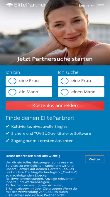 Finde jemanden, der dein Leben verändert. Nicht nur deinen Beziehungsstatus. ✓ Partnersuche mit ElitePartner: Handverlesene Profile ✓ TÜV SÜD-zertifizierte Software ✓ Jetzt gratis anmelden!