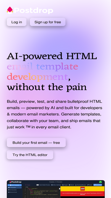 82%Test HTML email templates, preview results, and share bulletproof emails powered by Postdrop.io.