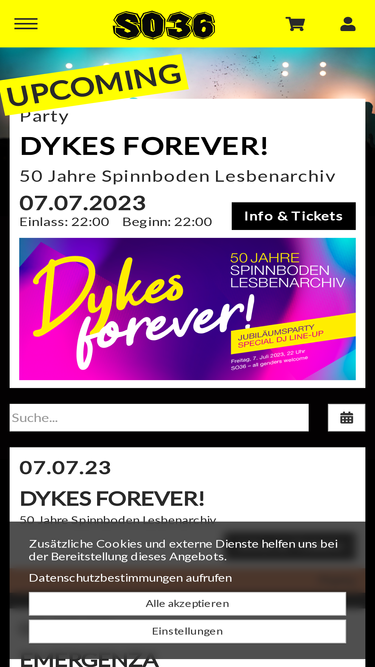 90%Das SO36 wendet sich gegen jede Form von sexistischen, rassistischen oder homophoben Äußerungen oder Handlungen. Bei Missachtung behalten wir uns vor, Gästen Hausverbot zu erteilen oder Veranstaltungen oder Darbietungen abzubrechen.Nicht umsonst trägt die Halle am Heinrichplatz das Kürzel des alten Postzustellbezirkes Kreuzberg, denn in diesem traditionsreichen Raum trifft eine lebendige Gegenwart auf eine spannungsreiche Vergangenheit. Betrieben wird das SO36 von dem Verein Sub Opus 36 e.V., der sich in erster Linie als kulturfördernder Initiator versteht. So bietet die Halle heute Raum für Newcomer, harte Töne jenseits des Chartsmainstreams und Veranstaltungen verschiedenster Projekte. Wo früher Punk dominierte, findet man heute auch HipHop, CrossOver,Techno und vieles mehr.
