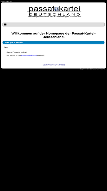 100%die homepage der passat-kartei-deutschland. die passat-kartei ist eine interessengemeinschaft für passat/santana-fahrer der typen 32/33, 32b und 32b-299 (baujahre bis 03/1988). sie haben einen passat, baujahr 73-88? dann sollten sie mal reinschauen!