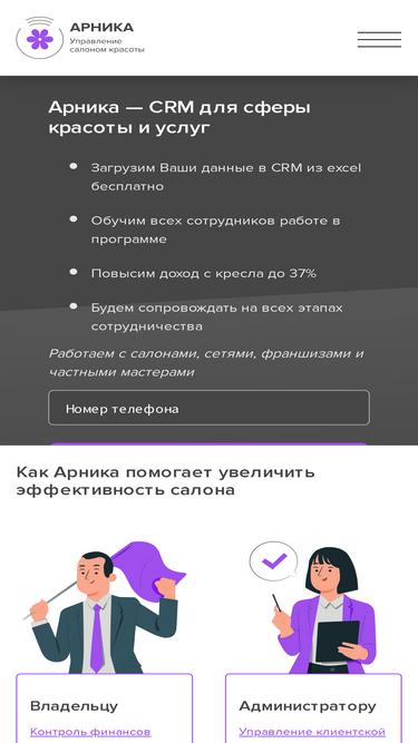 100%Программа для салонов красоты и сферы услуг. Работайте с мобильным приложением, расписанием и финансами в удобном интерфейсе CRM Арника.