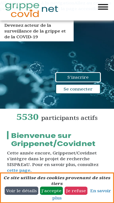 74%Grippenet/Covidnet permet de surveiller la circulation des infections respiratoires grâce à un réseau de citoyens volontaires. Il est mis en place par par l'Institut Pierre Louis d'Epidémiologie et de Santé Publique, sous tutelle de l’Inserm et de Sorbonne Université, en coordination avec Santé Publique France.