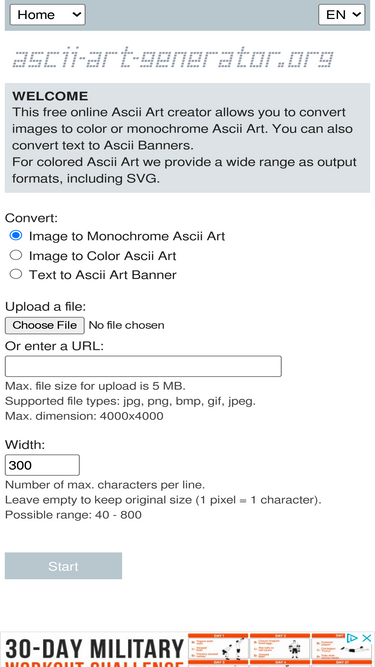 100%free online tool to create colored or monochrome ascii art. also including a text to ascii banner option.