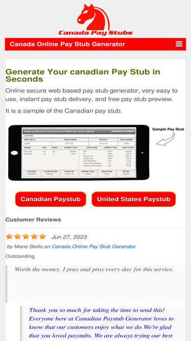 100%Canada Online paycheck stub generator