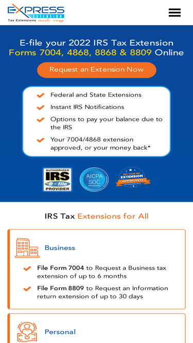 70%E-file your Tax Extension Form in just a few minutes with ExpressExtension and receive instant IRS approval.
