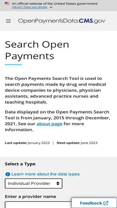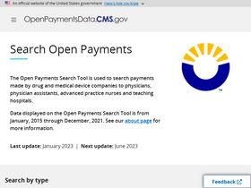 85%The official U.S. government website that houses data collected and published by Open Payments, a federally mandated program that collects information about payments that reporting entities, including drug and medical device companies make to covered recipients like physicians.