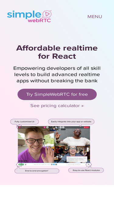 83%simplewebrtc is the easy, fun, and cost-effective way for devs of all skill levels to build advanced realtime apps with react. start developing for free!