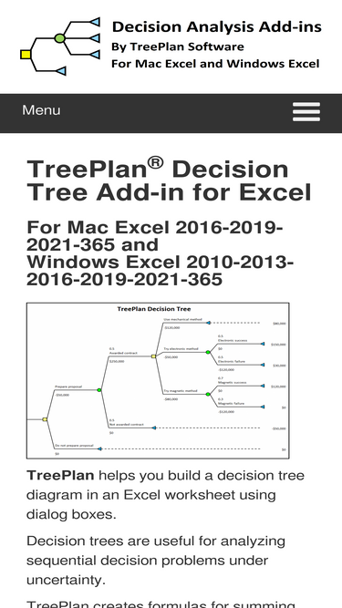76%TreePlan® Decision Tree Add-in for Excel For Mac Excel 2019-2021-2024-365 and Windows Excel 2019-2021-2024-365 You can purchase TreePlan risk-free with