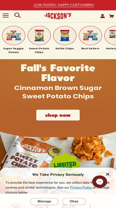 100%Beware of Imi-Taters At Jackson's, we've mastered the art of crafting snacks with premium avocado oil, a better-for-you fat that puts other oils to shame. While other snack brands settle for cheap seed oils, we never compromise on quality. We even go the extra mile to rigorously third-party test our suppliers. Our commitment to uncompromising standards sets us apart from the Imi-Taters who miss the mark on delivering truly heroic ingredients. A savory sensation We believe that snacking should be a joy, not a source of stress or compromise. Our mouthwatering snacks are crafted to satisfy your cravings while being friendly to nearly every diet imaginable. Gluten-free? Check. Vegan? Check. Free from the top 9 allergens? You bet! With Jackson's, you can embrace the joy of snacking without ever having to check the label twice.